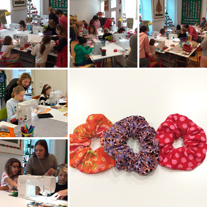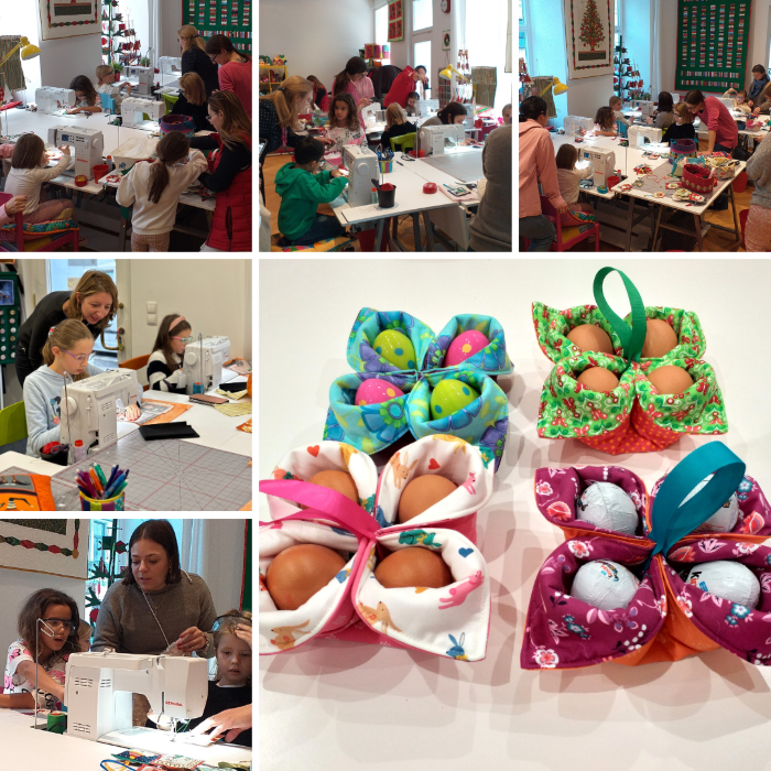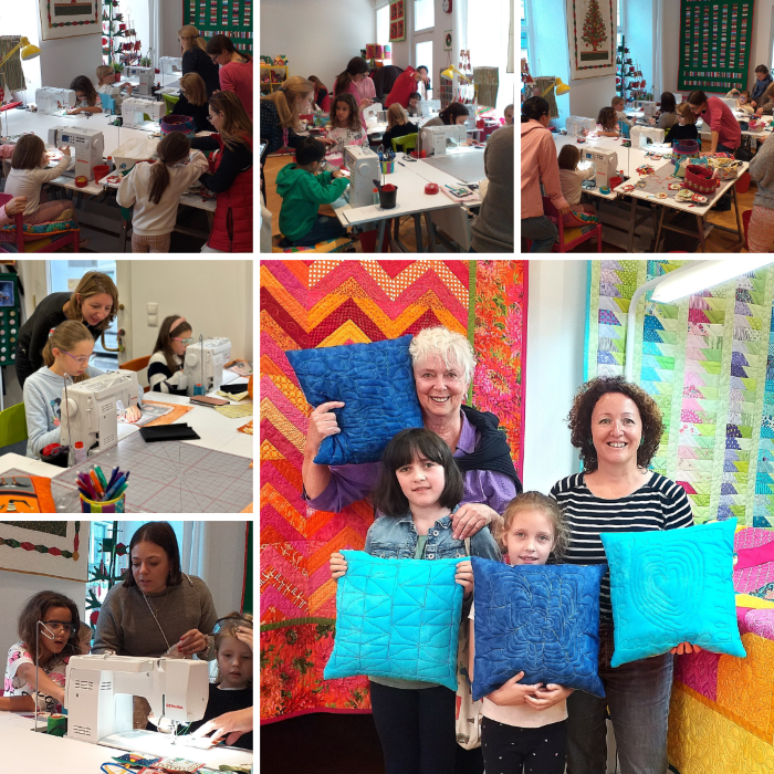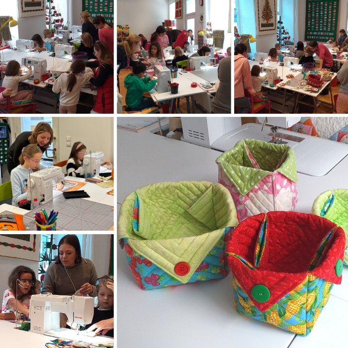 Kinder lernen mit einer Nähmaschine und Patchwork- und Nähwerkzeugen zu arbeiten, die Stoffe zuzuschneiden und zu kombinieren, damit sie am Ende ein wunderschönes Produkt als Ergebnis zeigen können. Sie nehmen die fertigen Produkte nach Hause natürlich mit.